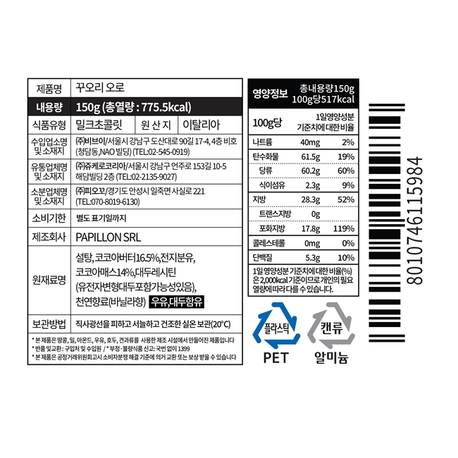 총 내용량 130g, 100g 당 517kcal / 100g당 (1일 영양성분 기준치에 대한 비율)-나트륨40mg(2%), 탄수화물61.5g(19%), 당류60.2g(60%), 식이섬유2.3g(9%), 지방28.3g(52%), 트랜스지방0g, 포화지방17.8g(119%), 콜레스테롤0mg(0%), 단백질5.3g(10%), 1일 영양성분 기준치에 대한 비율(%)은 2000kcal 기준이므로 개인의 필요 열량에 따라 다를 수 있습니다